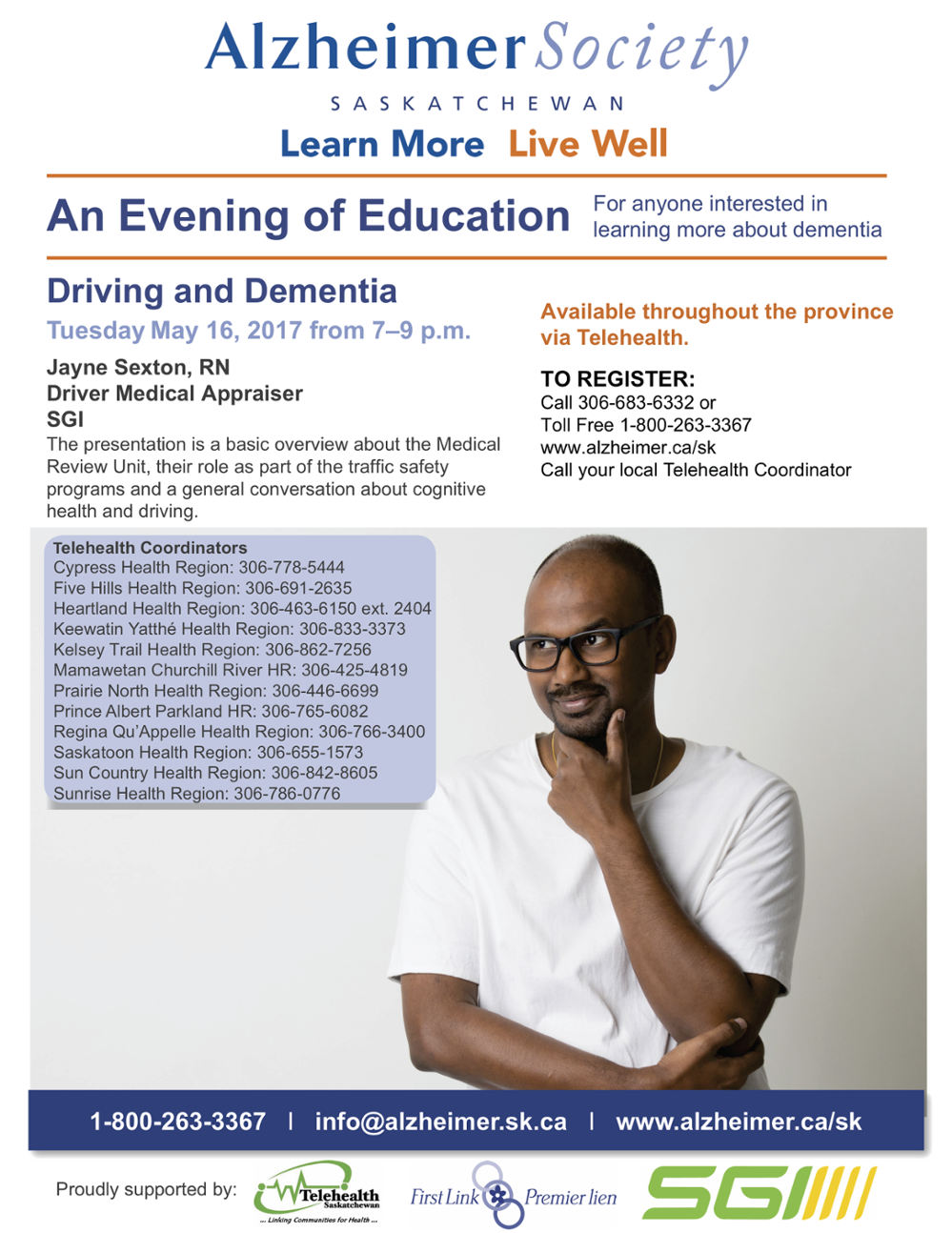 Tuesday, May 16th, from 7 to 9 pm the Alzheimer Society of Saskatchewan presents An Evening of Education (via TeleHealth at sites across Saskatchewan)