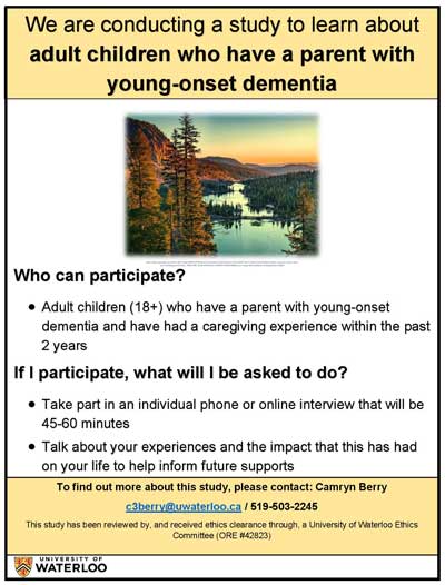 Participants needed for University of Waterloo student-led study to describe the perceptions of the caregiving role from the perspective of adult child young-onset dementia caregivers.