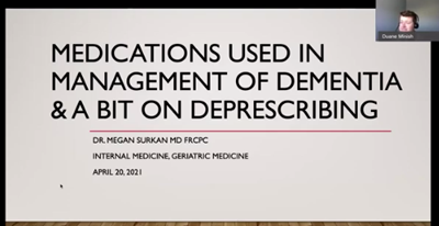 The video of her presentation "Medications used in management of dementia & a bit on deprescribing" is about one hour in length, and the slide deck is available.
